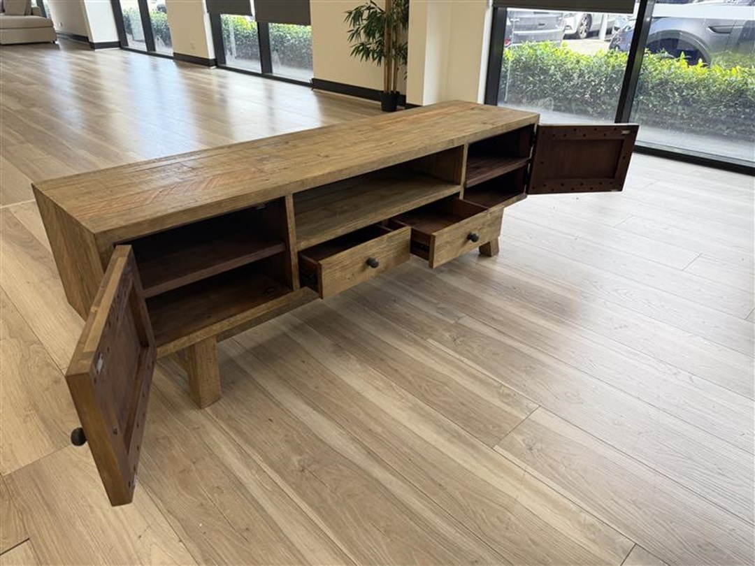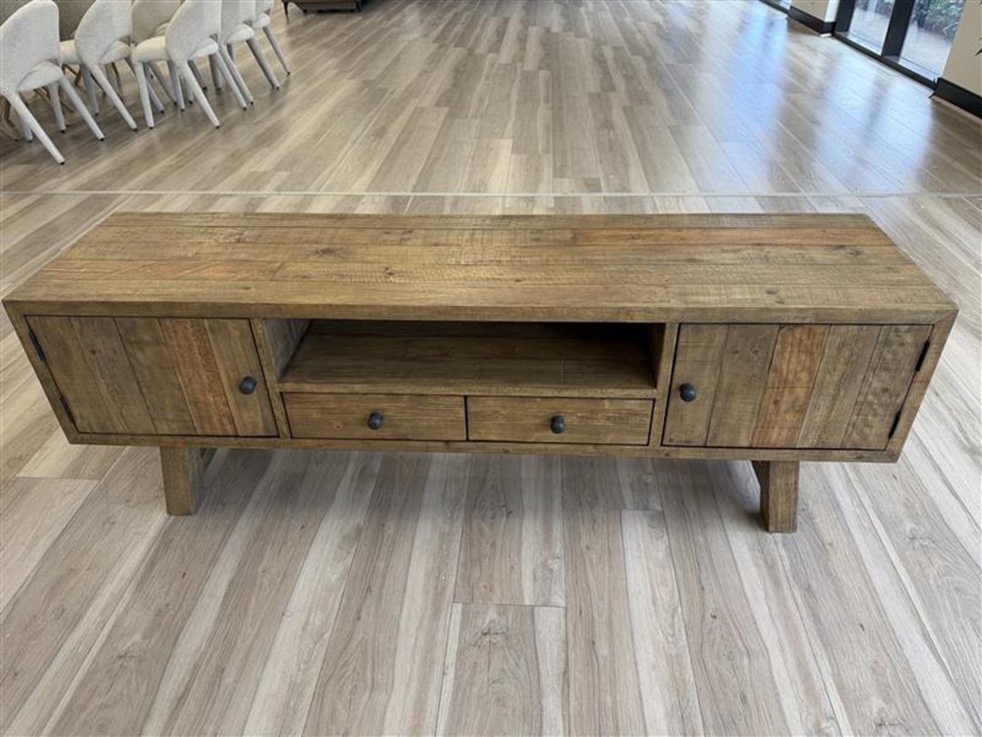 A versatile timber TV unit featuring 2 doors, 2 drawers, and 4 open shelves, perfect for neatly organizing media equipment and accessories. Its natural finish and ample storage make it a stylish centerpiece for any modern living room.