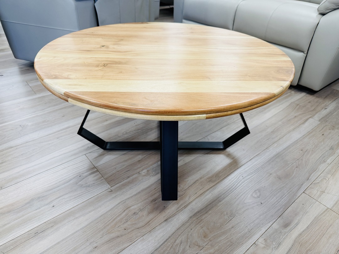 This coffee table combines a warm round timber top with sleek metal legs for a modern industrial feel. Its sturdy construction and compact shape make it ideal for everyday use while enhancing contemporary living spaces.