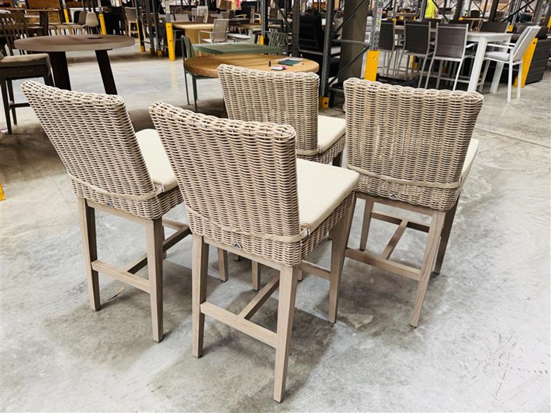 Stylish outdoor bar stools crafted with durable sand-toned wicker. Designed for comfort and outdoor use. Ideal for patios, balconies, or bar settings.