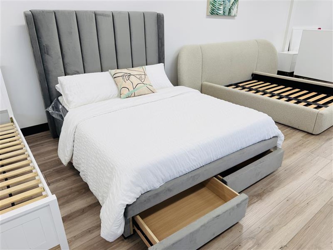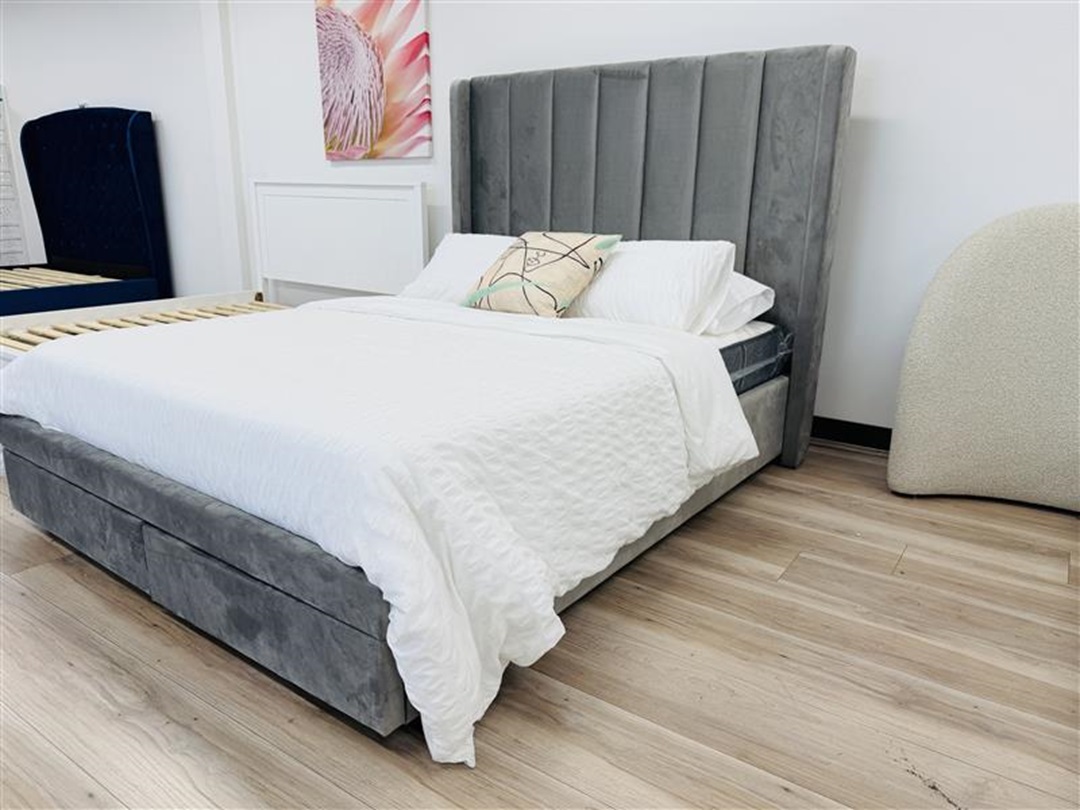 A stylish queen bed upholstered in elegant silver fabric, designed with two spacious storage drawers for added practicality. Combines modern comfort with smart storage to keep your bedroom organized and refined.