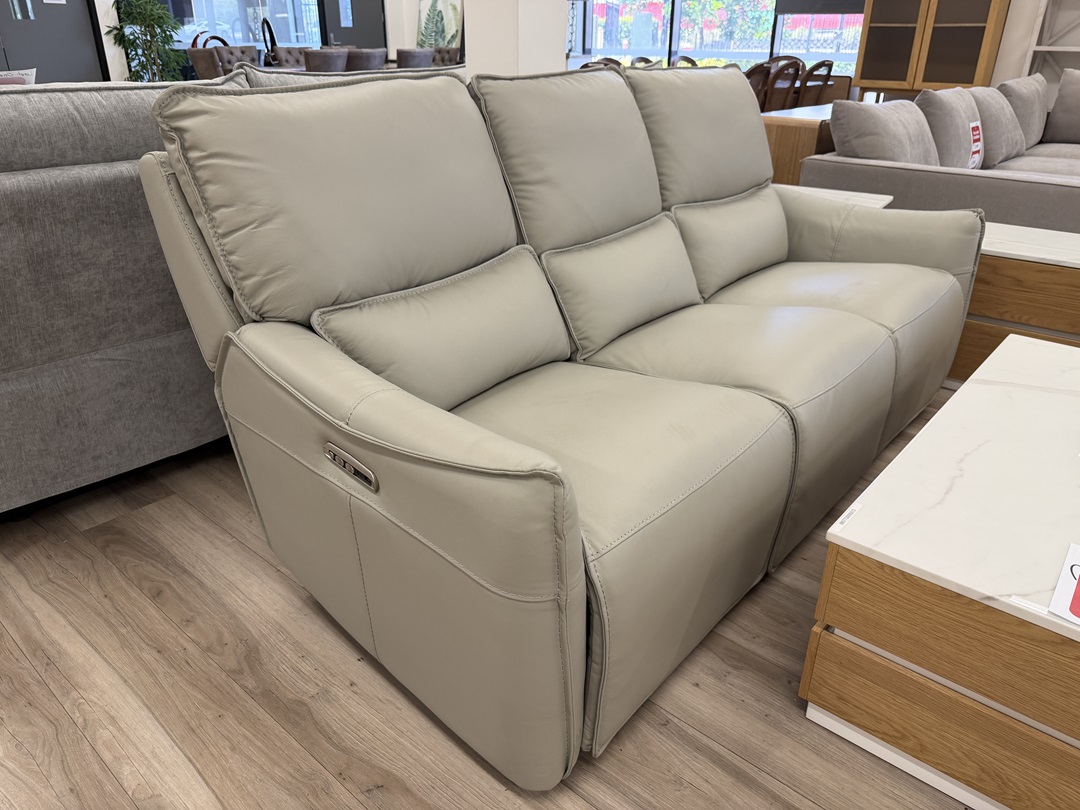 A luxurious 3+2 sofa set upholstered in silver grey leather that features smooth electric reclining functions for ultimate comfort and modern living room style.