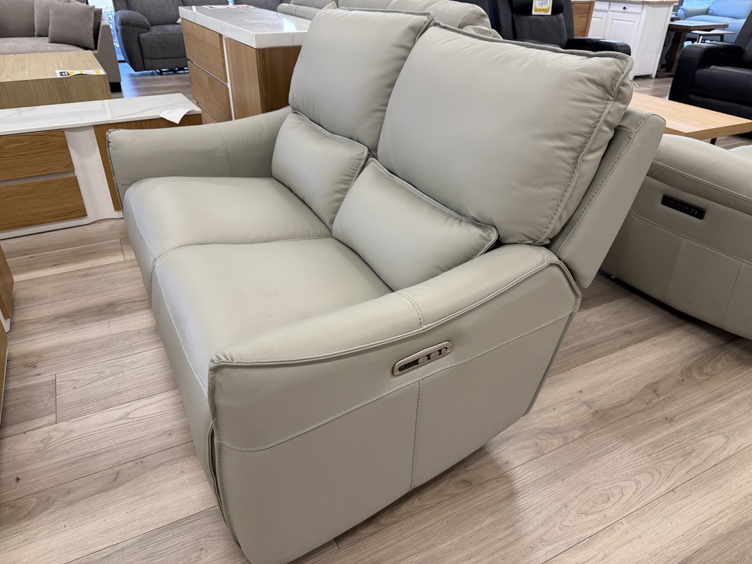 A compact yet luxurious 2 seater sofa in ash grey fabric, featuring an electric extendable footrest and a matching chaise. Designed for modern comfort and relaxation, it offers the perfect blend of function and style.