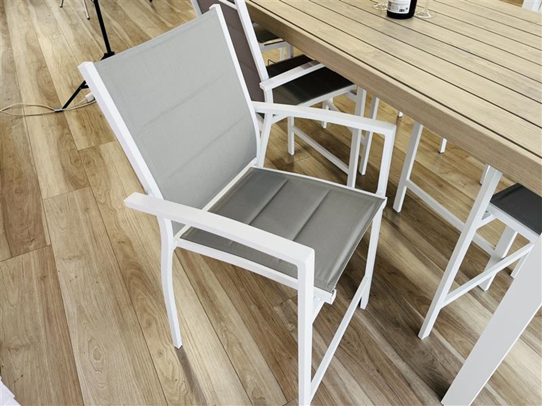 This contemporary 7-piece outdoor bar set features a durable smoke aluminium frame and comfortable seating. Built to withstand the elements, it’s perfect for entertaining outdoors. A sleek and modern choice for alfresco dining or drinks.