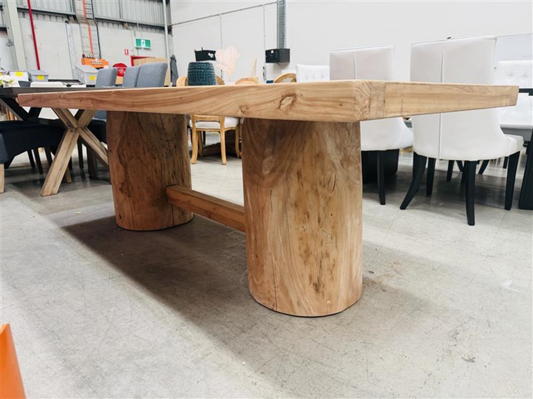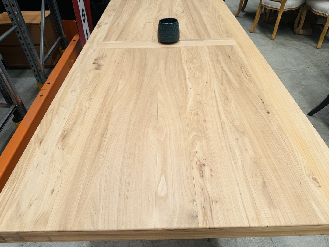 A large solid timber dining table designed for family gatherings, showcasing natural grain detail, durability, and generous seating space