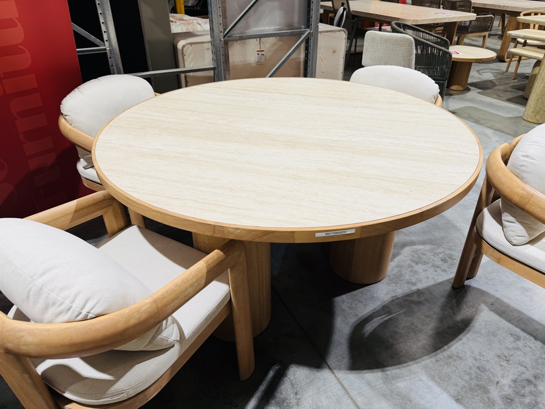 This outdoor dining set pairs a durable stone top round table with sturdy timber framing for a natural yet contemporary look. Complete with four matching chairs, it creates a welcoming and stylish alfresco dining setting.