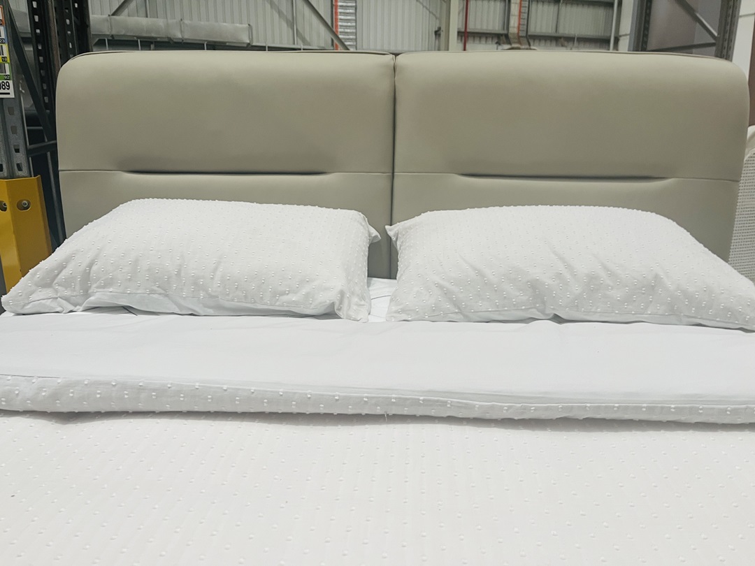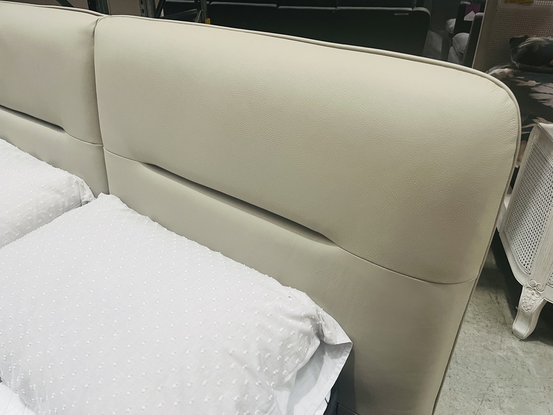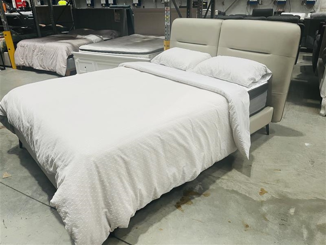 Upholstered in smooth taupe leather, this queen bed adds elegance and sophistication to any bedroom. Its sleek design pairs comfort with modern style. A durable and timeless piece for restful nights.