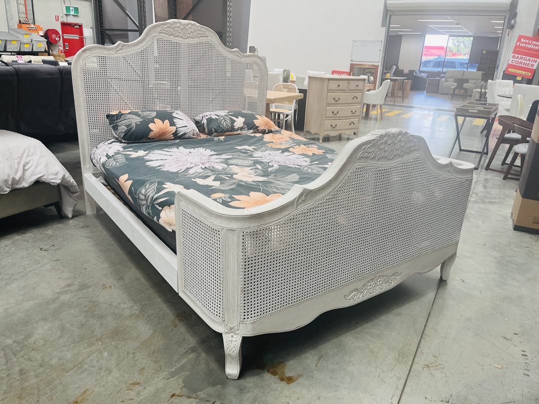 A charming whitewash timber bedroom suite, featuring a queen bed, two bedside tables, and a tallboy. Ideal for coastal, rustic, or farmhouse-inspired interiors.
