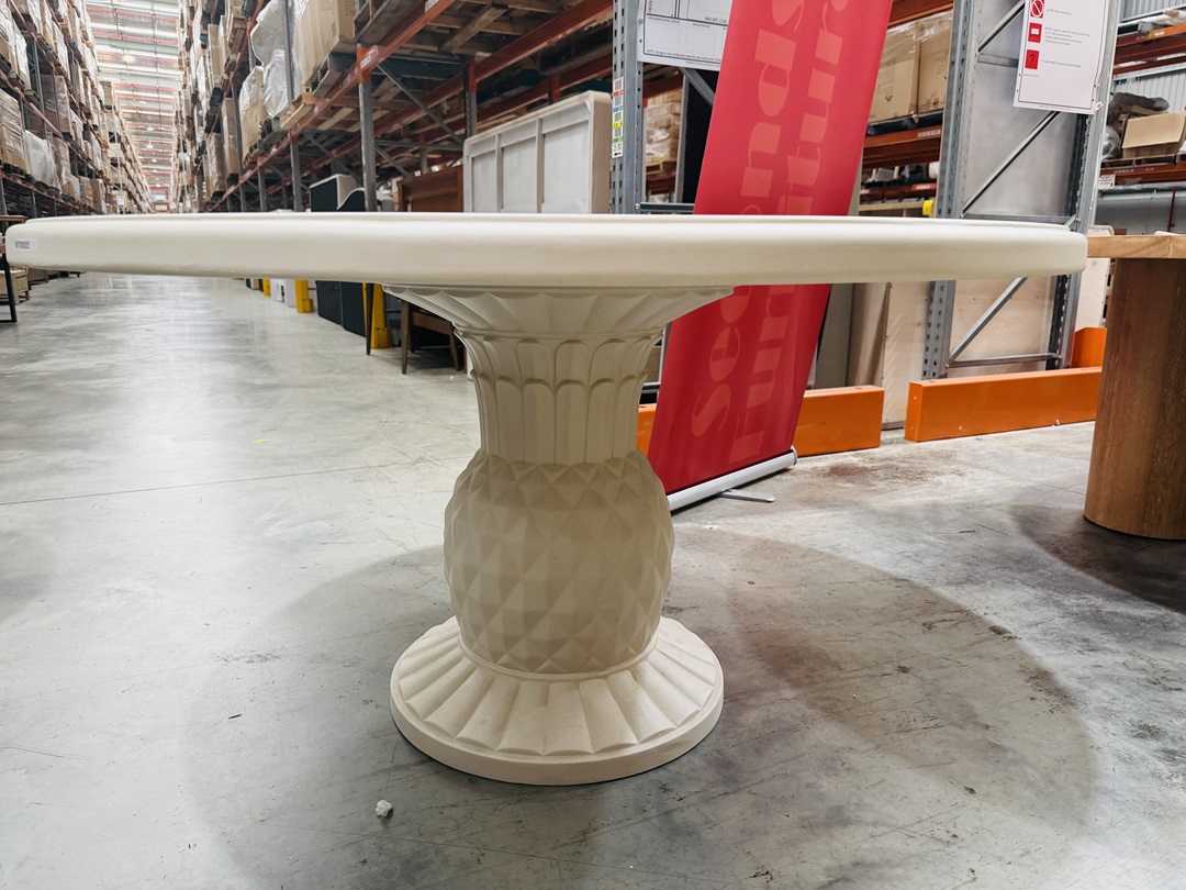 This concrete outdoor table features a unique tropical-inspired design that adds texture and visual interest. Built for strength and outdoor durability, it serves as a stylish focal point for patios and garden spaces.