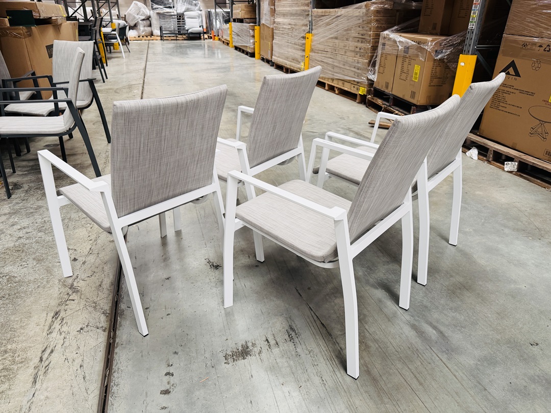A modern outdoor dining chair with a white aluminium frame. Features padded seating for added comfort. Perfect for stylish and durable outdoor dining setups.