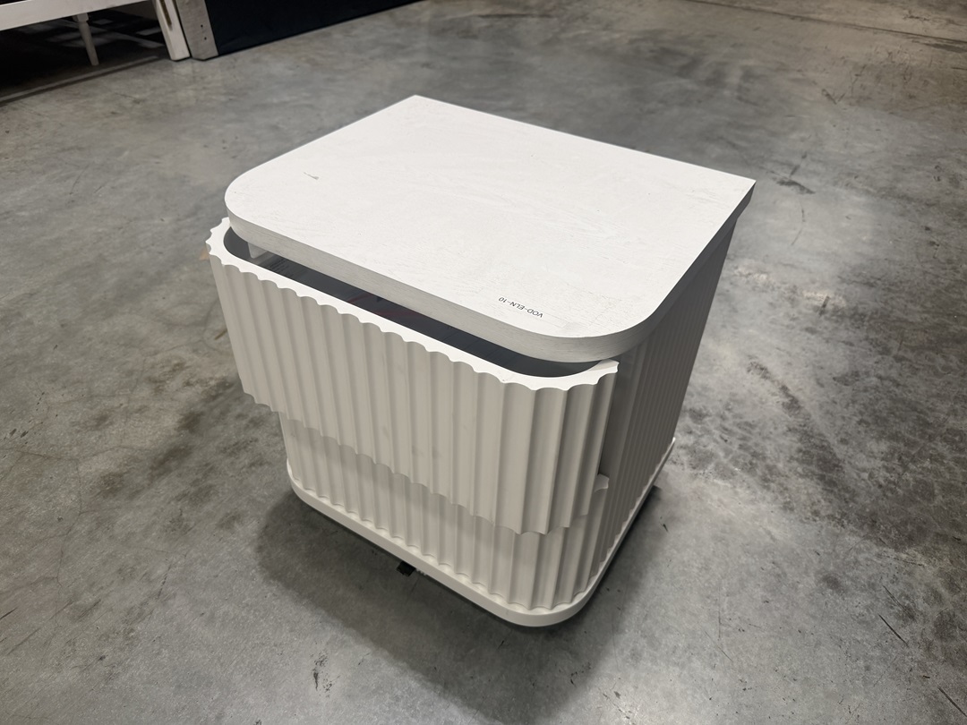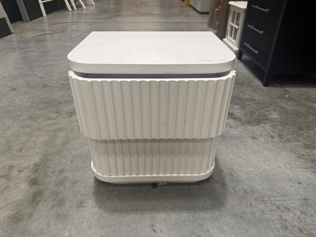 A modern bedside table featuring a sleek curved design and crisp white finish. With two practical drawers, it offers stylish storage while adding a soft contemporary touch to your space.