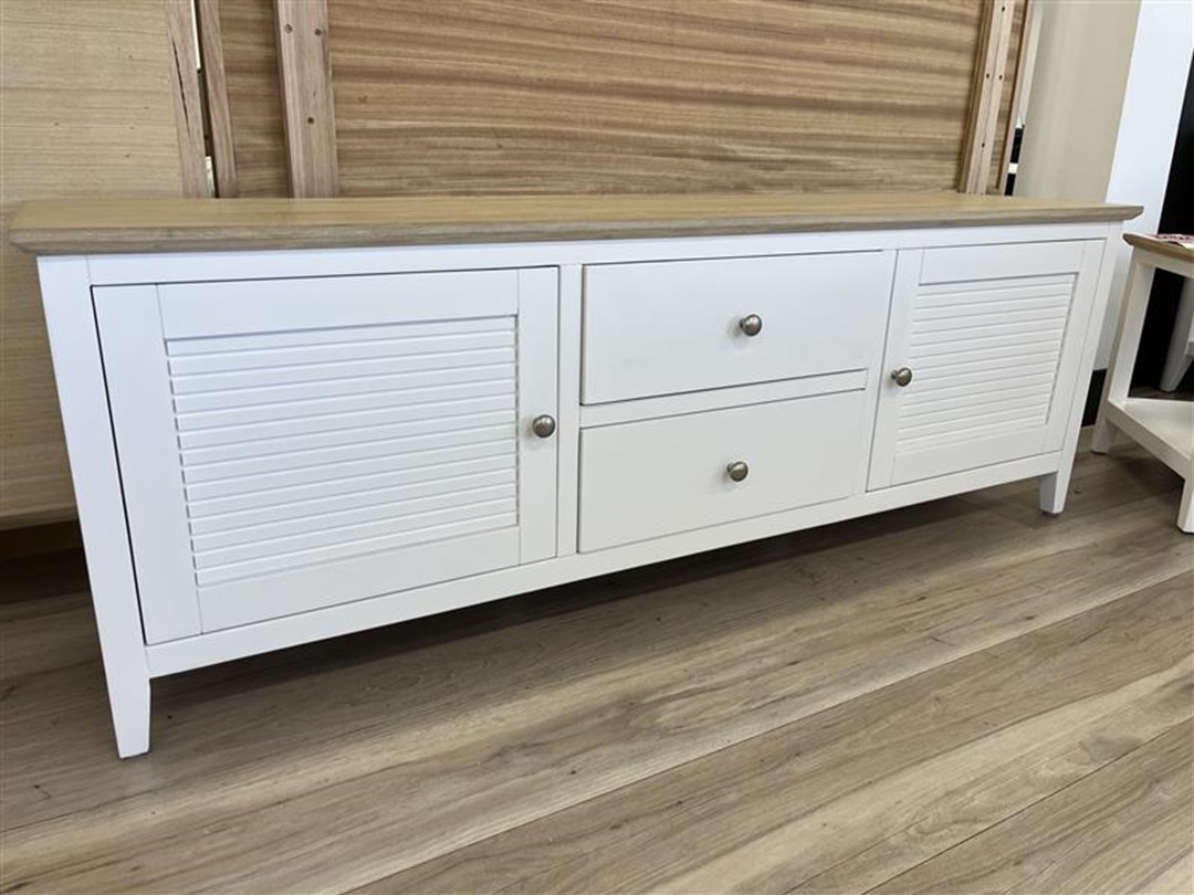 This TV unit, crafted from rich chestnut timber, offers two spacious drawers and two open shelves for media storage and display. The natural wood grain adds warmth and elegance to any living space, while its practical design ensures easy organization of electronics and accessories.