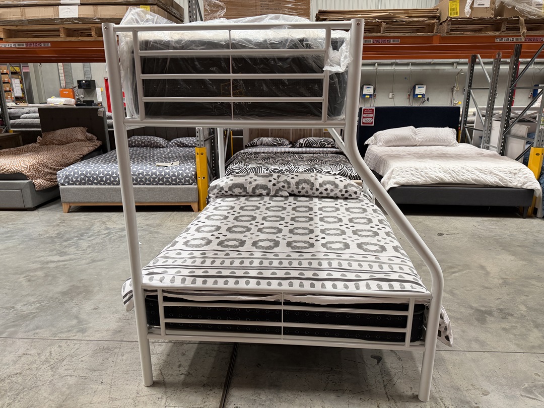 A durable white metal bunk bed with a single over double design that maximises space, offers strong support, and provides a clean modern sleeping solution.