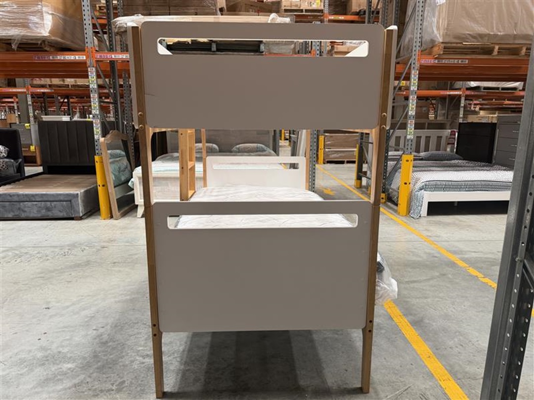A sturdy bunk bed crafted in natural and white timber tones. Designed as a single-over-single configuration, offering durability, safety, and a fresh modern look for kids’ or guest rooms.