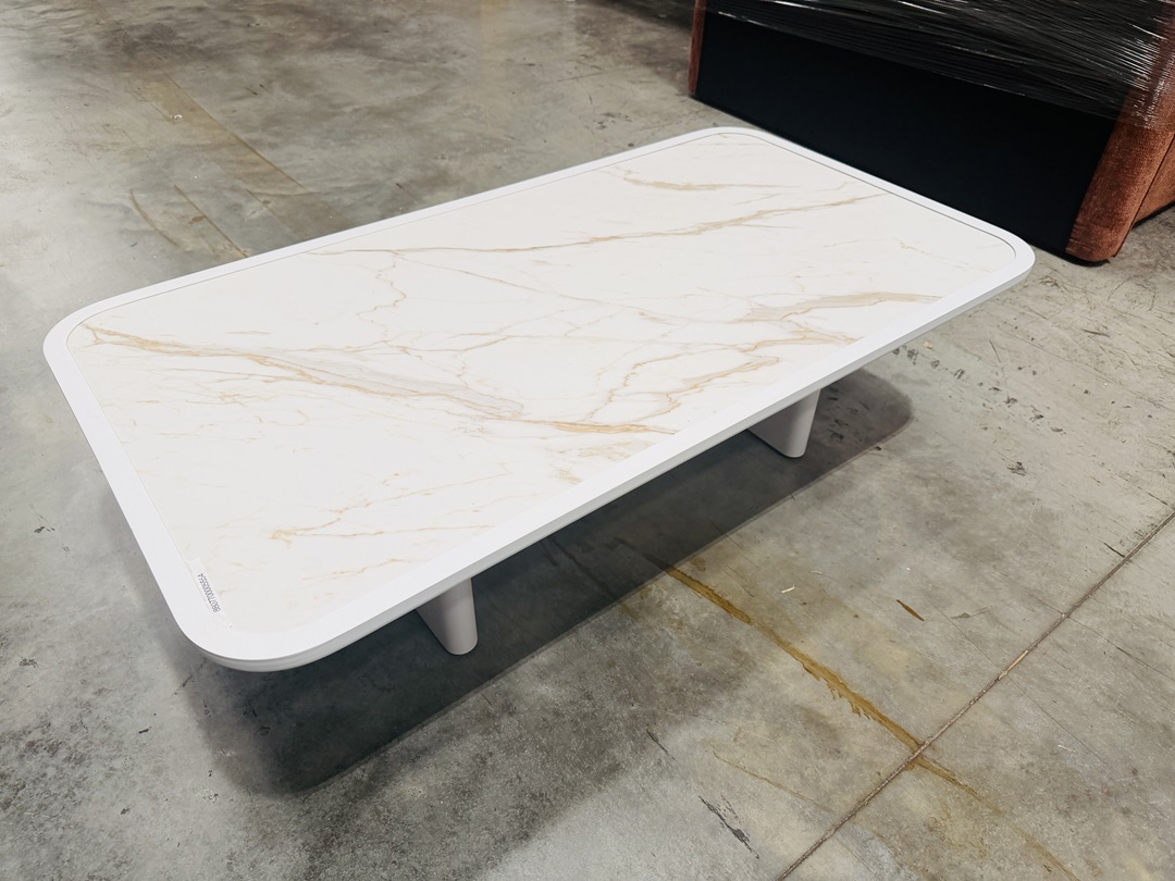 A stylish outdoor coffee table finished in white with a sophisticated marble-look top. Durable and elegant, it’s the perfect centerpiece for modern outdoor lounge settings.