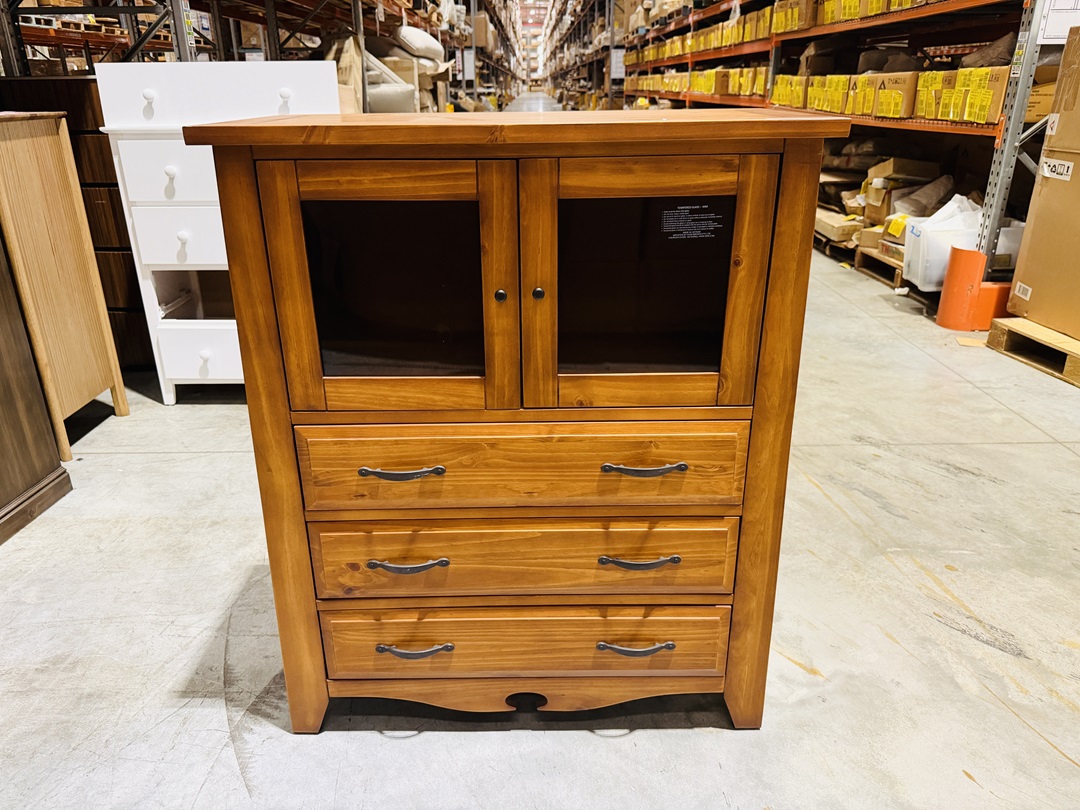 A sturdy timber tallboy crafted in a rich chestnut brown finish with five spacious drawers that provide generous storage while adding warmth and elegance to your room.