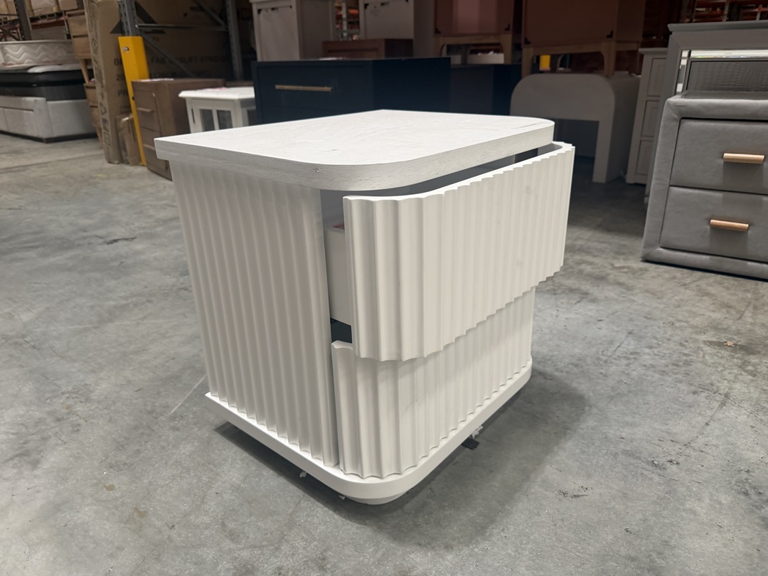Beautifully crafted from white timber, this bedside table features a unique curved design for a contemporary touch. It includes one smooth-gliding drawer for convenient storage. A stylish companion to any modern or classic bed setting.