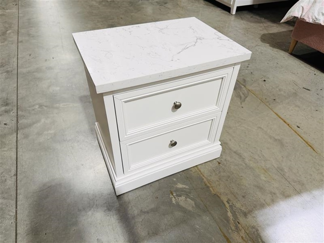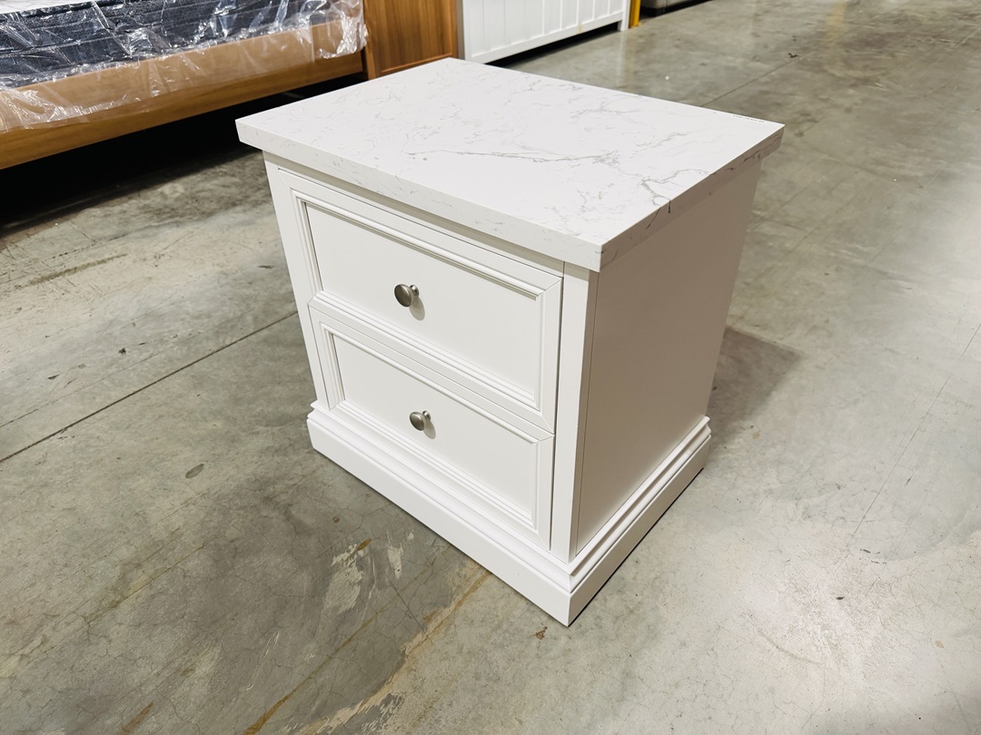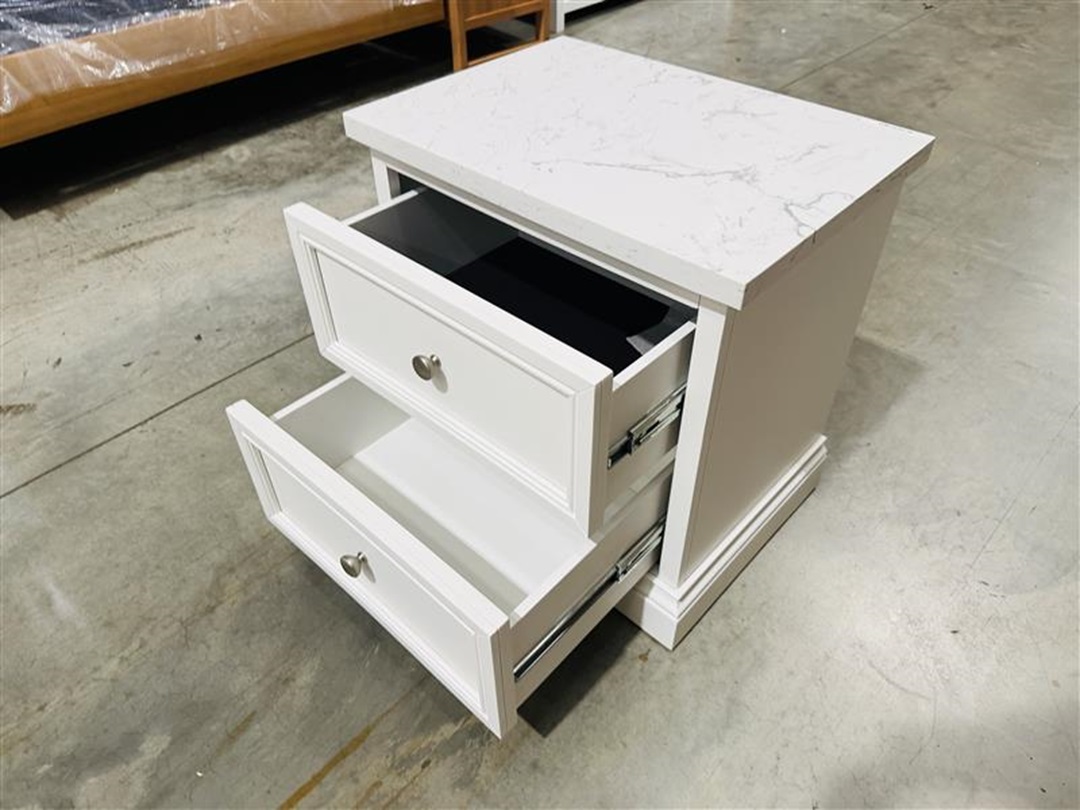 A stylish bedside table featuring a crisp white timber base paired with an elegant marble top. Designed with two spacious drawers, it offers practical storage while adding a touch of luxury to your bedroom.