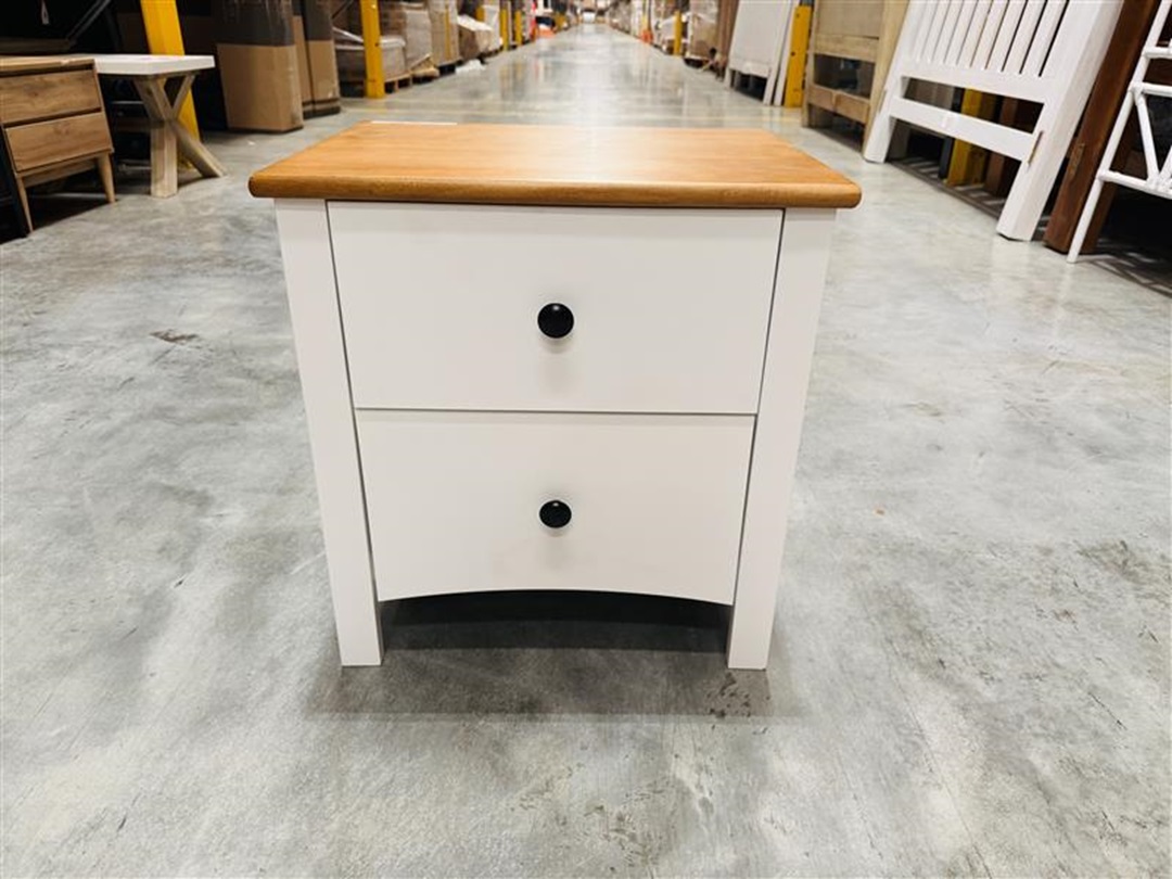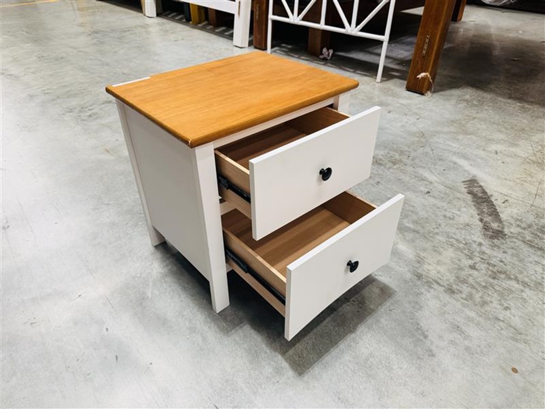A stylish bedside table featuring a white timber base with a contrasting teak top. Designed with two spacious drawers, it offers practical storage while adding a modern two-tone touch to your bedroom.