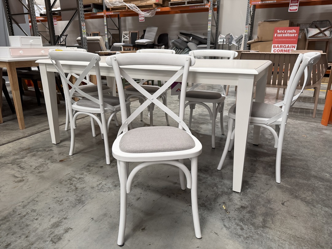 A bright, elegant dining set featuring a white timber table paired with six matching white crossback chairs. Ideal for coastal, Hamptons, or contemporary dining spaces.