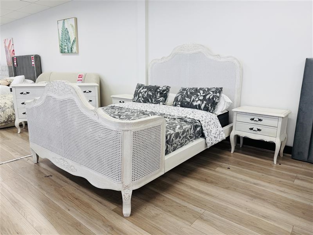 A stunning 4-piece queen bedroom suite crafted in white timber with elegant rattan detailing. The grand dresser with matching mirror and coordinated pieces create a light, stylish, and functional bedroom setting with generous storage.