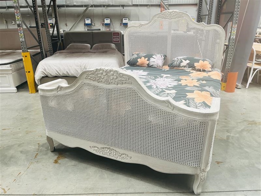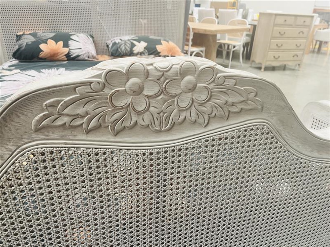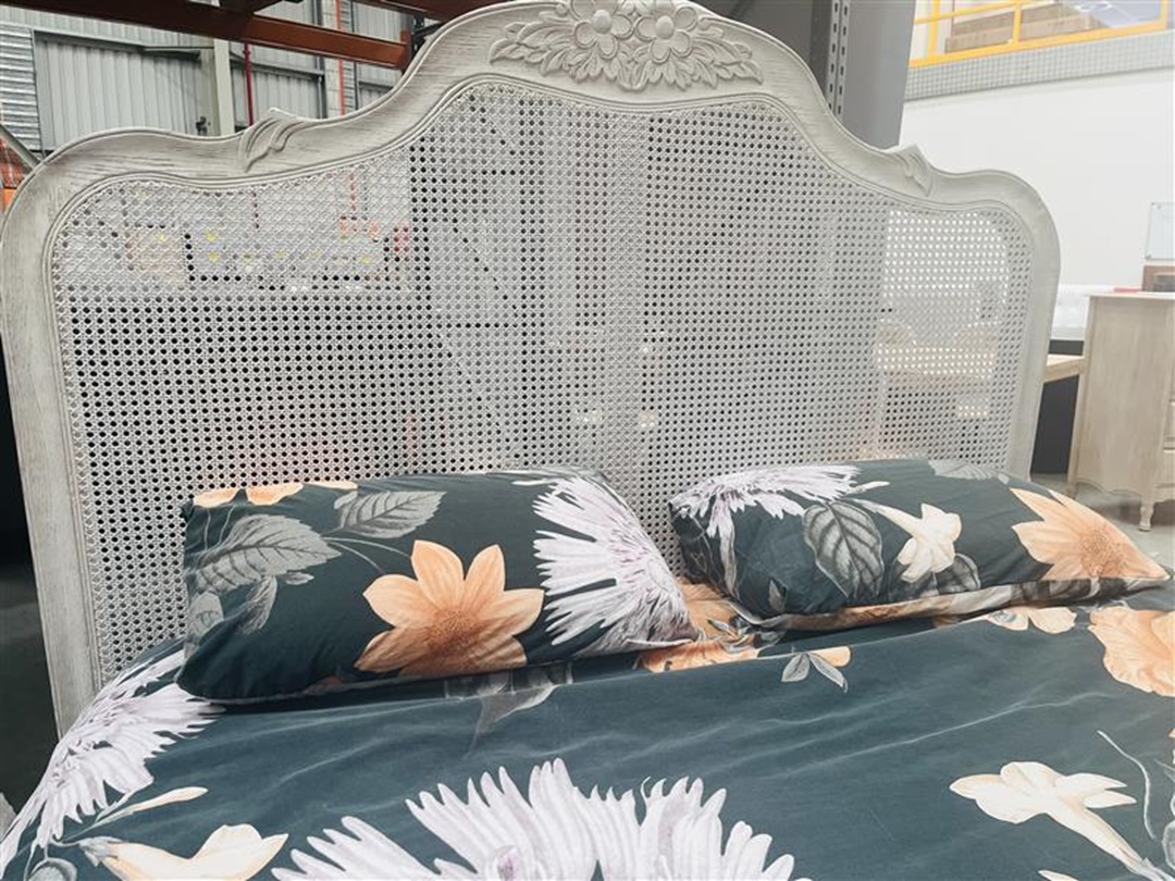 This queen bed combines classic white timber with natural rattan accents for a fresh floral feel. It comes complete with a comfortable mattress for convenience. A perfect choice for stylish bedroom living.