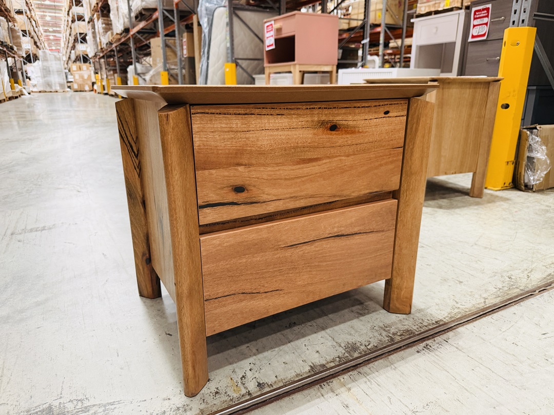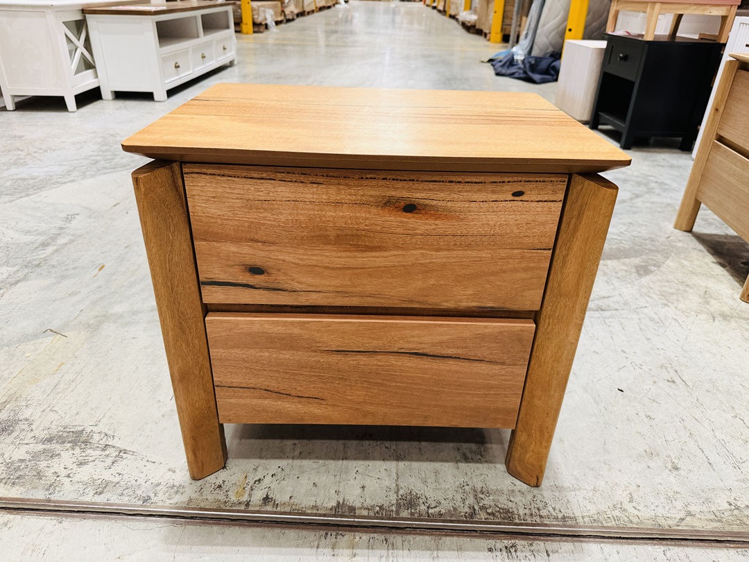 Crafted from beautiful jarrah timber, this bedside table features two spacious drawers for convenient bedroom storage. Its rich natural tones and sturdy construction add warmth and durability to any bedroom setting.
