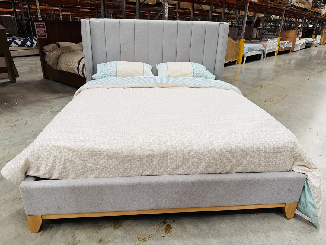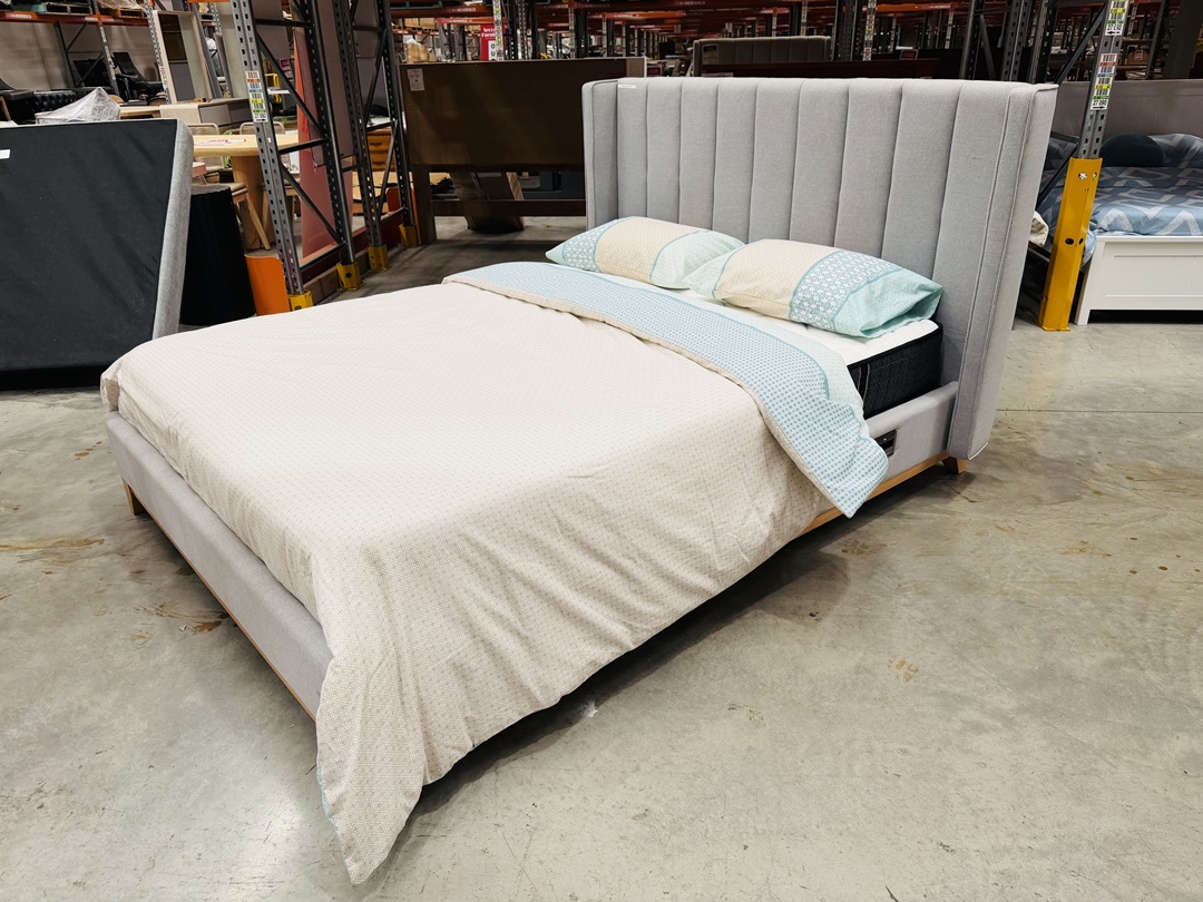 A modern queen bed upholstered in light grey fabric, complete with a comfortable mattress. Designed with convenience in mind, it features a built-in charger and USB ports in the headboard, making it perfect for today’s connected lifestyle.
